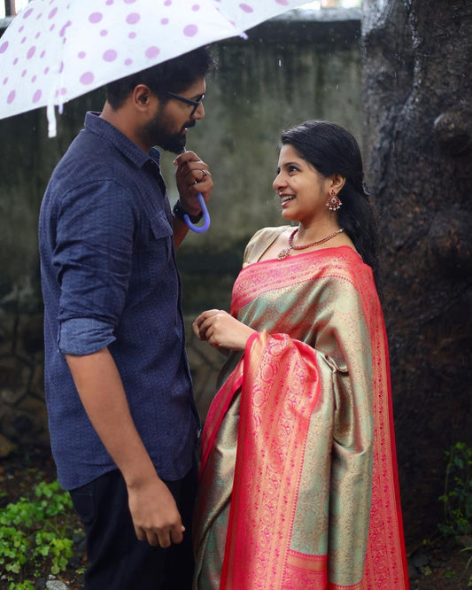 Maroon and Pink Kanjivaram Silk Saree with Golden Zari Forest Motif
